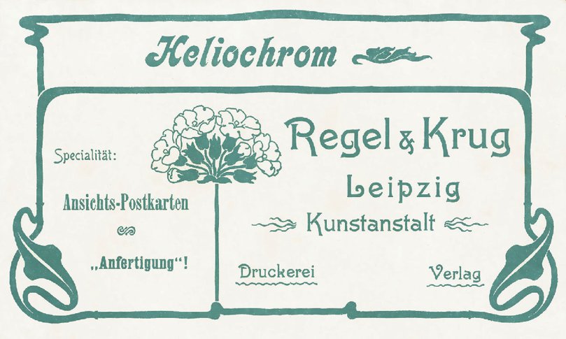 First found at Kohlgartenstr. 57 (rear building). By 1907 R&K had moved into own 4-story building at Comeniusstr 13-15. Started off as typical chromolitho printers, used collotype process for some years, then concentrated on "Autochrom" process (own process named "Heliochrome") and finally installed real photo printing facilities. Many photo card series. The earlier topo card output was more and more replaced by greeting/subject cards. From 1921 the business was run by Syl. Rich. Krug together with heirs of G. Regel.