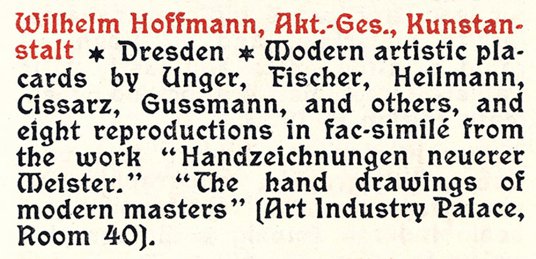 Finally on 13 January 1913 the W. Hoffmann joint-stock company was renamed into Dresdner Kunstdruckerei A.G. (at new address) BUT immediately liquidated again. So it was possible that the open commercial partnership Kunstanstalt Wilhelm Hoffmann Inh. Altmann & Fohmann could be continued at old address. Directed by shareholders Carl Heinrich Altmann and Josef Anton Fohmann. The company was specialised in art facsimile reproductions, poster and postcard printing in 1913. Had 7 letterpress, 9 collotype and 5 litho flatbed presses and employed some 80 workers.