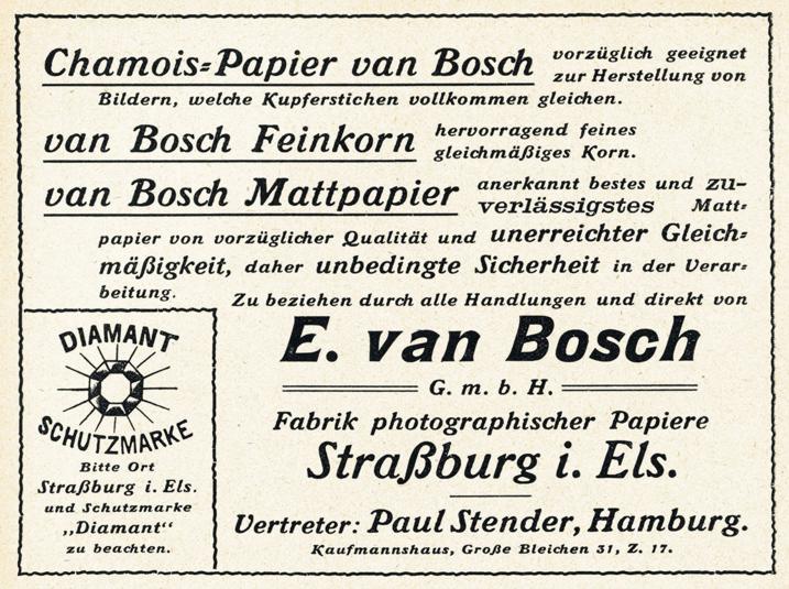 E. van Bosch GmbH became part of the big photopaper manufacturer group Vereinigte Fabriken photogr. Papiere A.G. (establ. 1874/"Crossed Swords" photo paper logo), Dresden. E.v.B. company headquarters were moved from Strasbourg-Schiltigheim to Dresden in January 1912. First operating as separate company with offices at Blumenstr. 80, but run by directors from parent company already. The E. van Bosch business said to had been taken over completely some time in 1915.