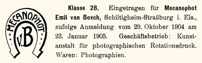 Mecanophot Emil van Bosch business was officially registered (business capital 90,000 Francs) in October 1904. The Mecanophot horseshoe with v.B. inside logo was registered as trade mark on 23 January 1905 (application entered on 29 October 1904) in Germany. The horseshoe logo found imprinted on address side, but likely on earlier issues only. The more popular logo was "M v.B." with card number arranged on image at lower left or right corner.