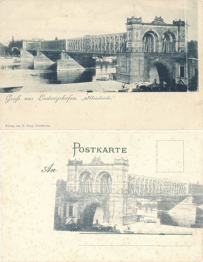 I show a printing mistake sample from pre-1905 origin. M. Hepp from Mannheim published a view titled "Greetings from Ludwigshafen" showing the bridge across the River Rhine. The collotype printed image shows a defect seen at right hand position. Okay, nothing really dramatic. But part of the bridge image (mirror image) is found printed also on the address side. Someone had a bad day.