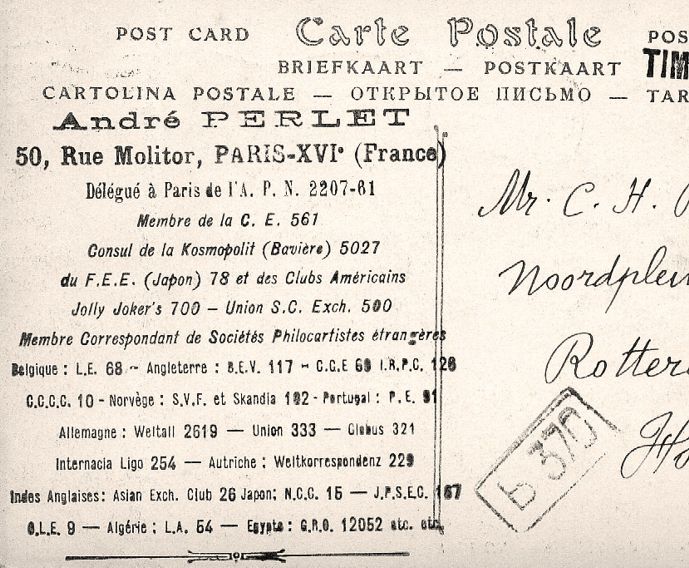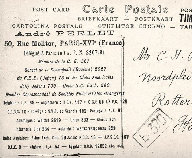André Perlet from Paris, France was probably the "King" when it comes to the most memberships in postcard and philatelist clubs and societies worldwide. This person was a favourite research topic of the late Frans Bokelmann from The Netherlands for some time. Although André did not collect any postcards himself – but used postage stamps only. I recall we managed to find more than 30 cards mailed out by him. Half of the address side covered mostly by a rubberstamp imprint listing some 20 clubs and societies worldwide. But he was member in even more!