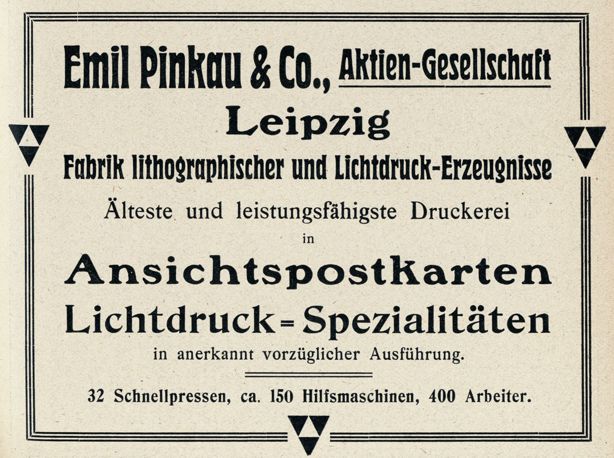 Emil Pinkau & Co. A.G. was another favourite research project of George Webber and others. Pinkau described themselves as oldest and biggest German ppc printer. In fact it was really one of the biggest German postcard printers and exporters. The advert mentiones 32 flatbed presses, 150 other machines and some 400 workers by 1909.